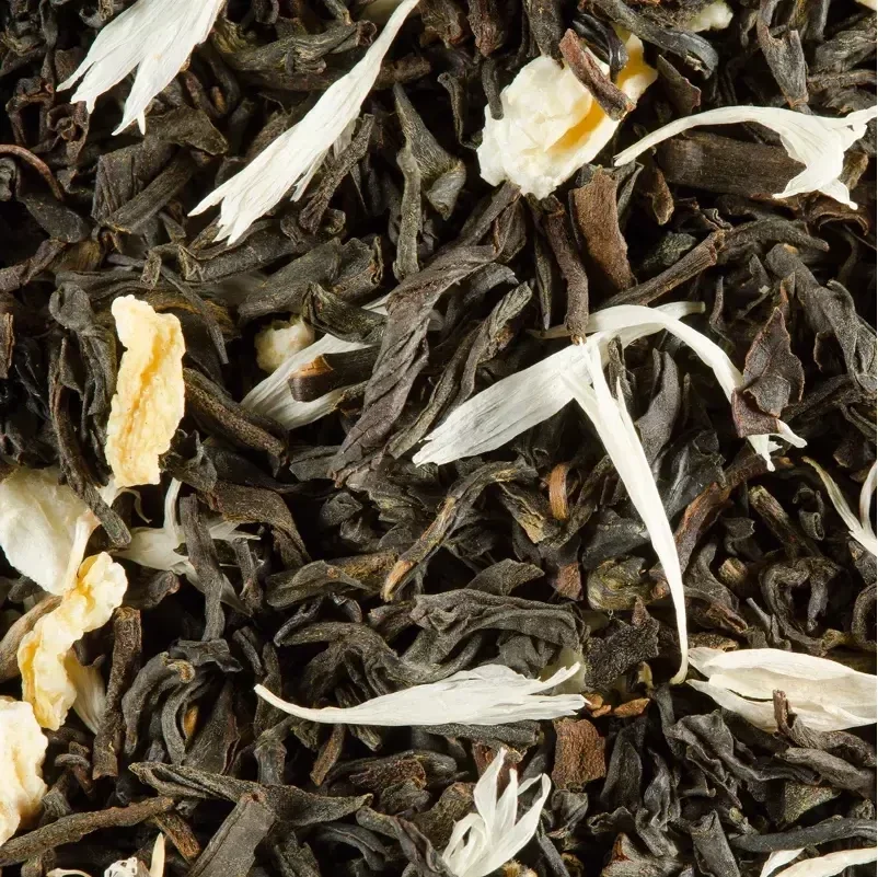Zwarte thee (Camellia sinensis), citroenkaviaararoma en essentiële bergamotolie, bergamotschil, bloemblaadjes